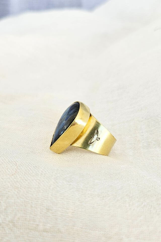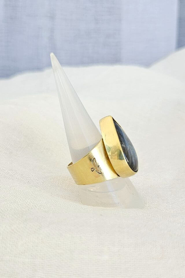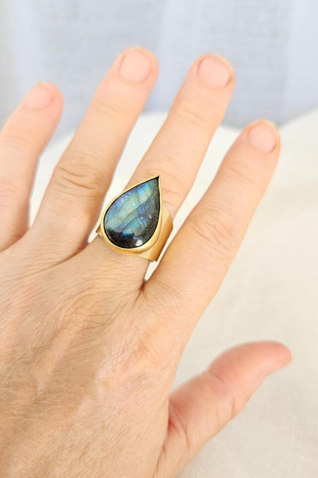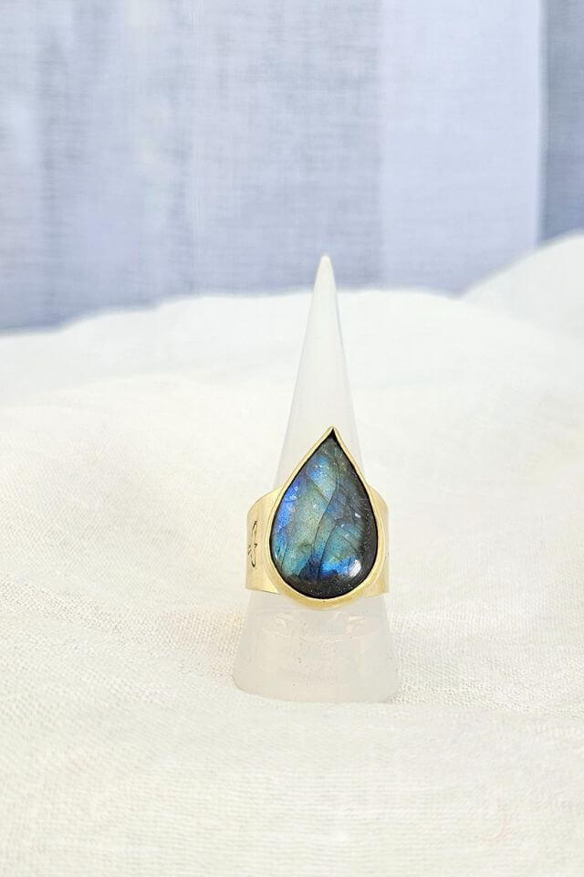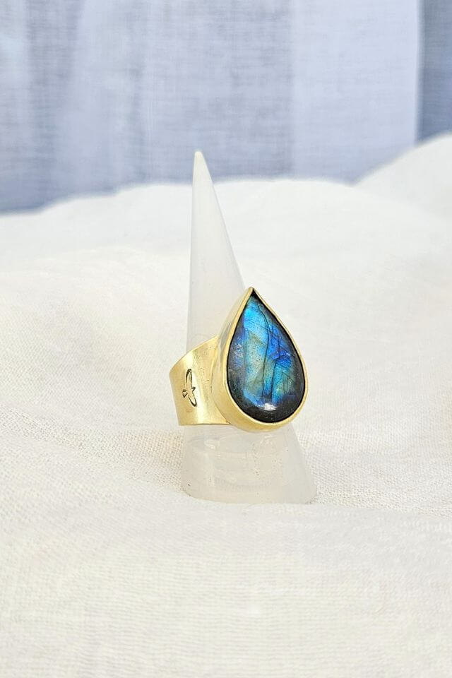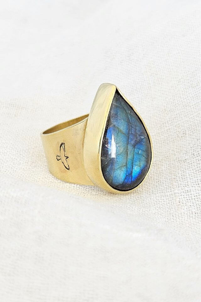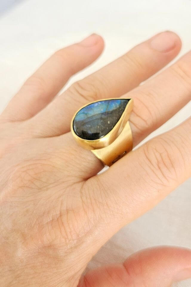 Embrace the earthy warmth of brass with a flashy, blue-toned Madagascan labradorite, the stone of transformation.
