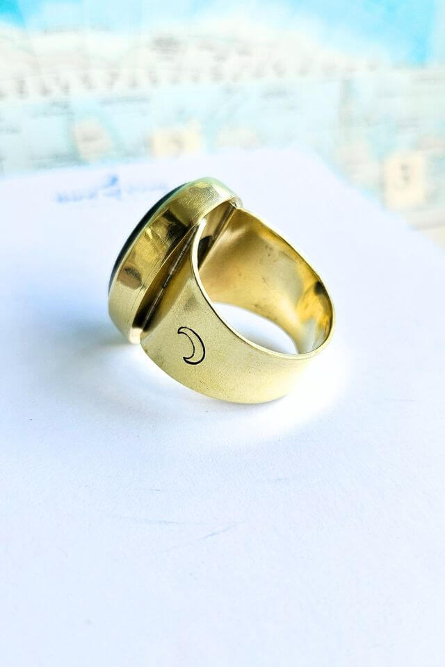 The secure, wide brass band is side-stamped with crescent moons and the signature bird of prey back-stamp.